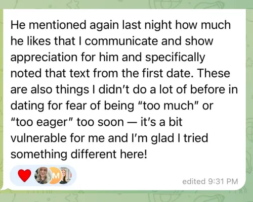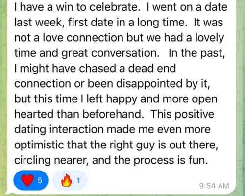 Jen stayed silent about what she needed for years. We activated her natural ability to express needs. On her fourth date, she finally said: "I need consistent communication to feel connected." Instead of running, he said "Thank you for telling me - I want to show up for you." The right man celebrates your asks, he doesn't punish you for having them.